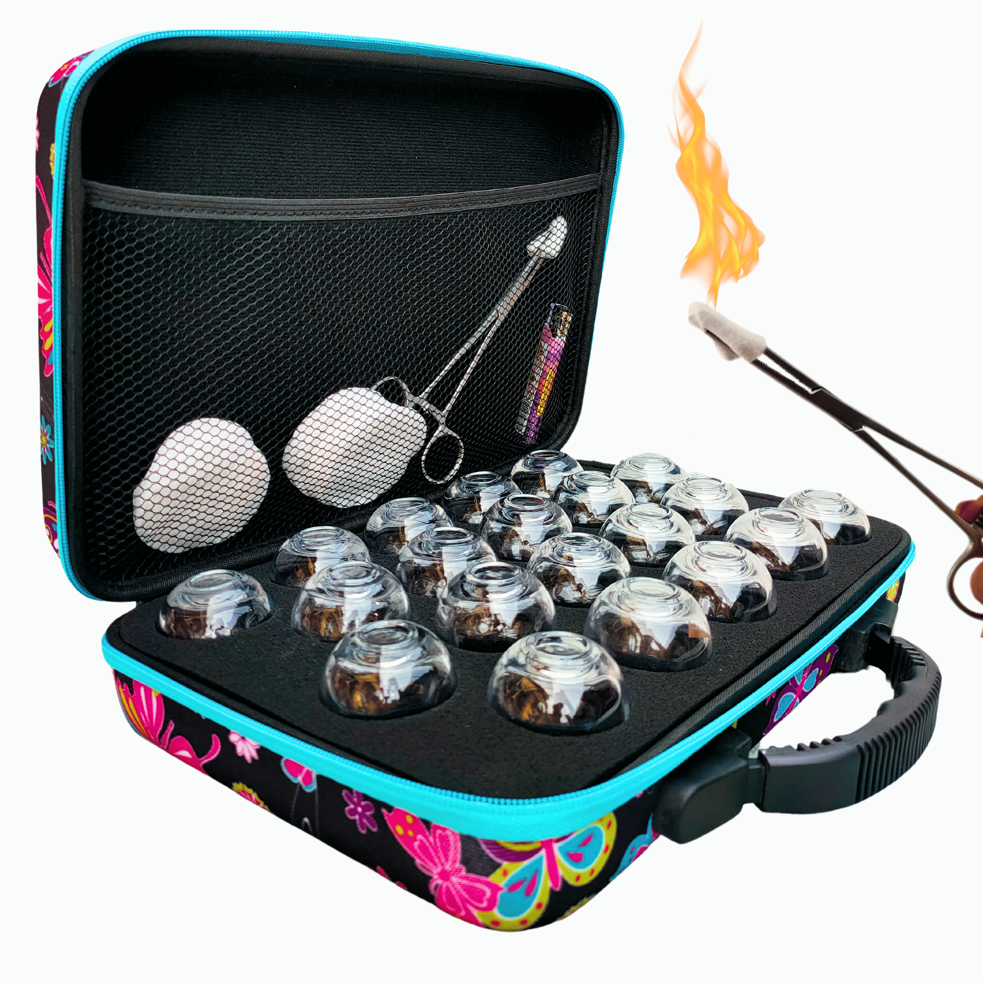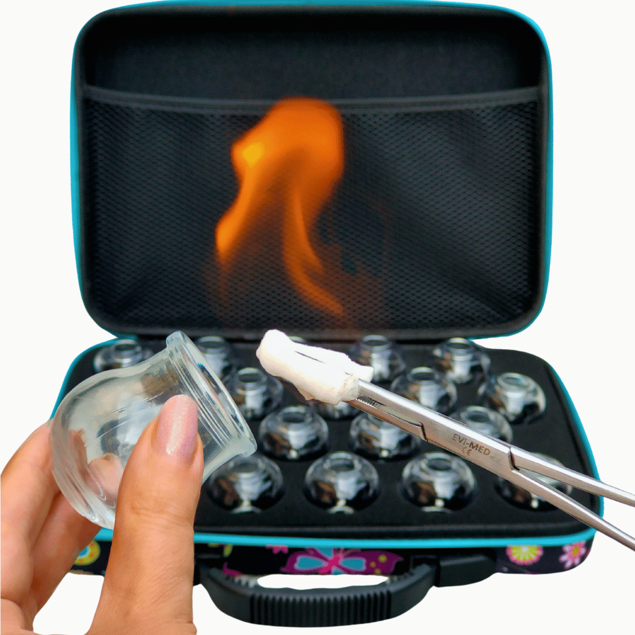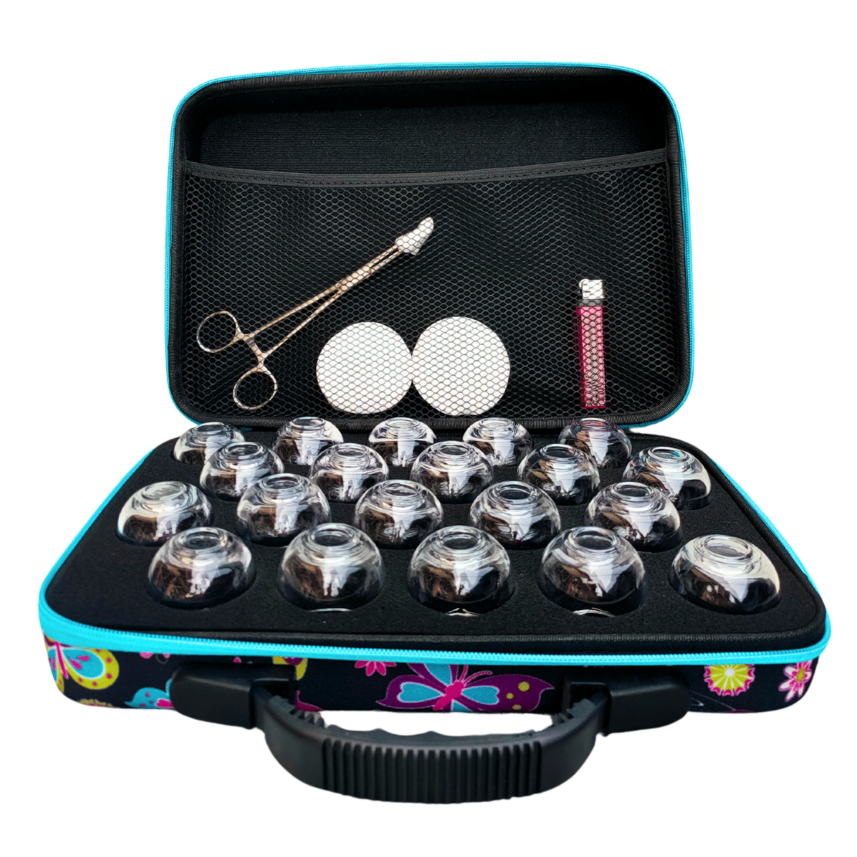Bańki ogniowe szklane 20 szt. – zestaw w etui Ciemne Motyle i szczypczyki