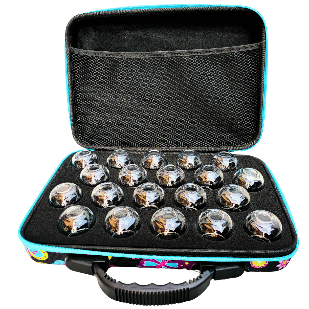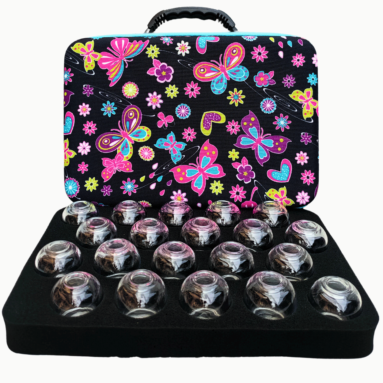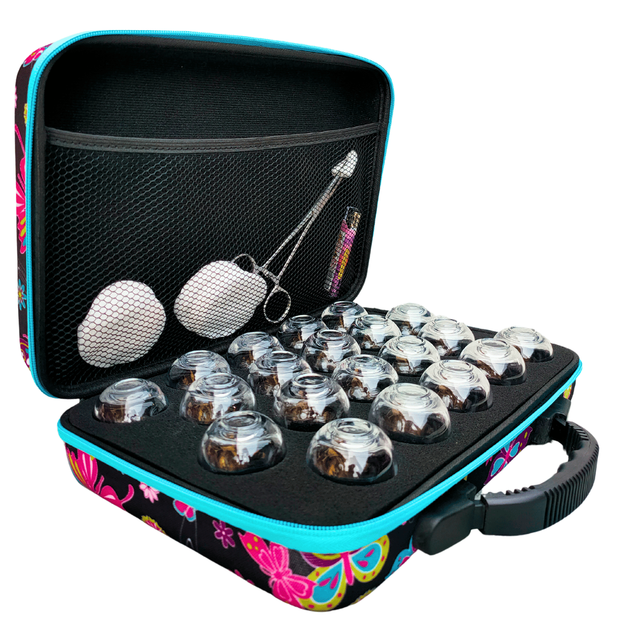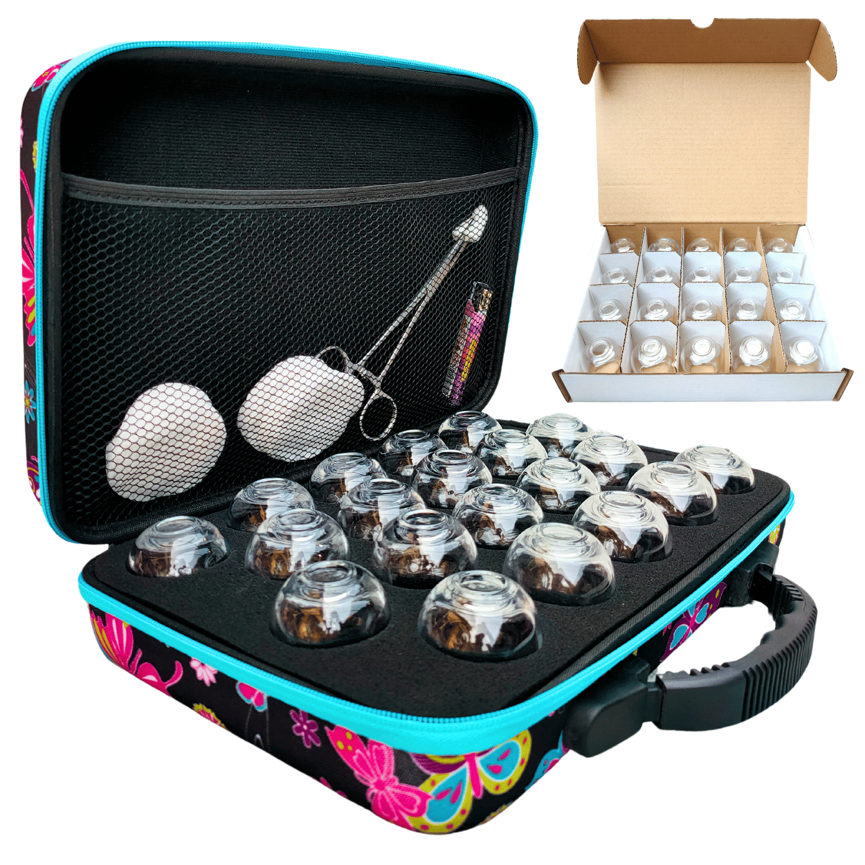 Bańki ogniowe szklane 20 szt. – zestaw w etui Ciemne Motyle i szczypczyki