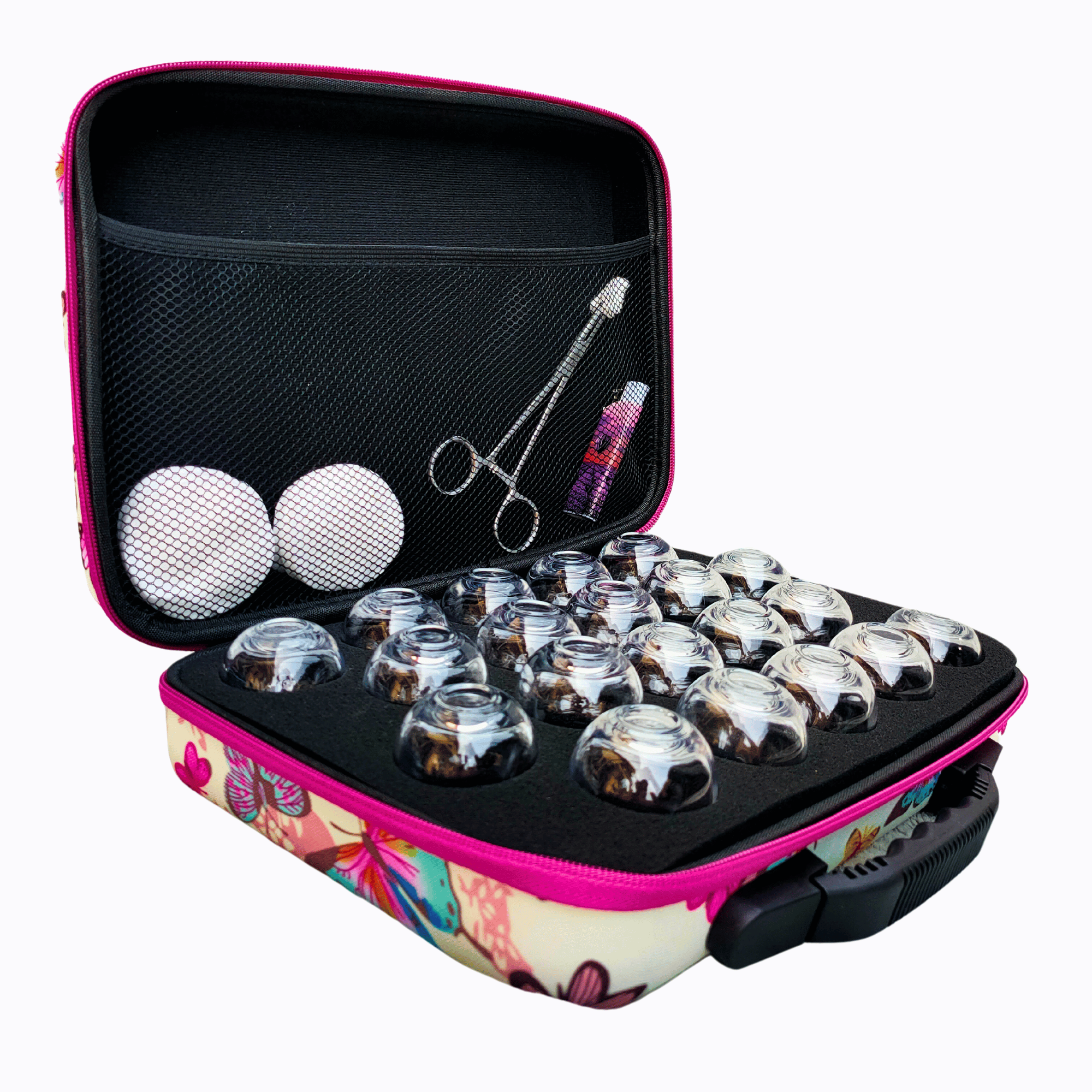 Walizka, futerał na bańki szklane ogniowe lekarskie 20x 3-3,5 cm jasne motyle z różowym paskiem w zestawie z bańkami lekarskimi ogniowymi (20 sztuk) oraz profesjonalnymi szczypczykami.