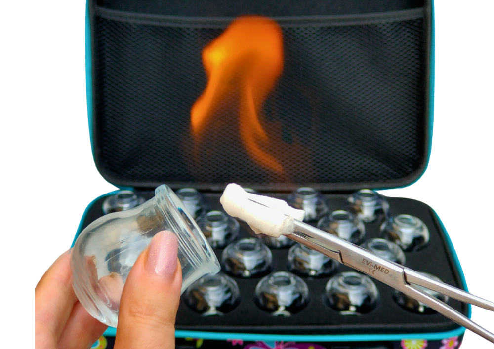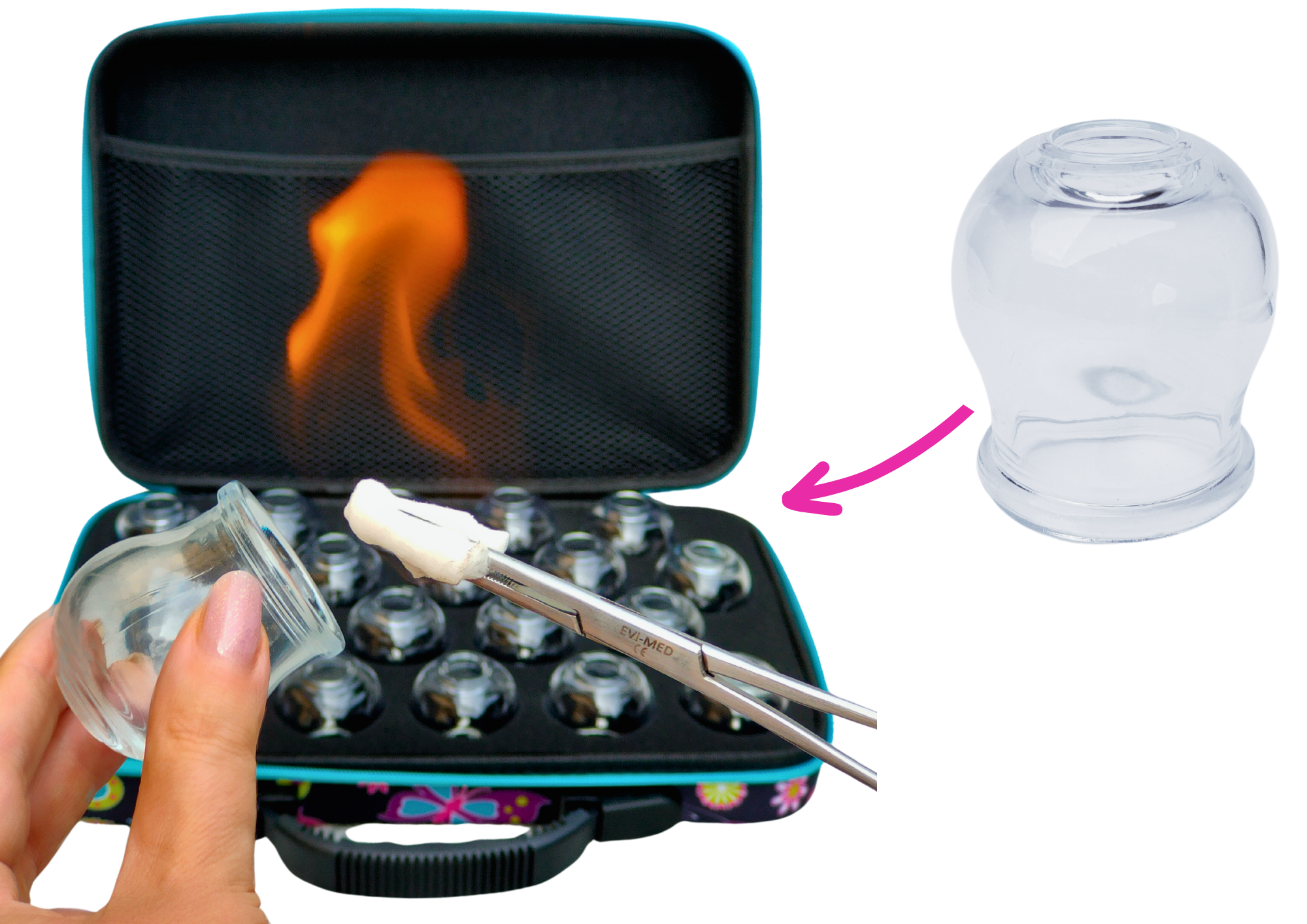 Walizeczka posiada na jednej ze ścian siateczkową kieszonkę, do której możesz włożyć potrzebne akcesoria do stawiania baniek jak: zapalniczkę, waciki, szczypczyki chirurgiczne.