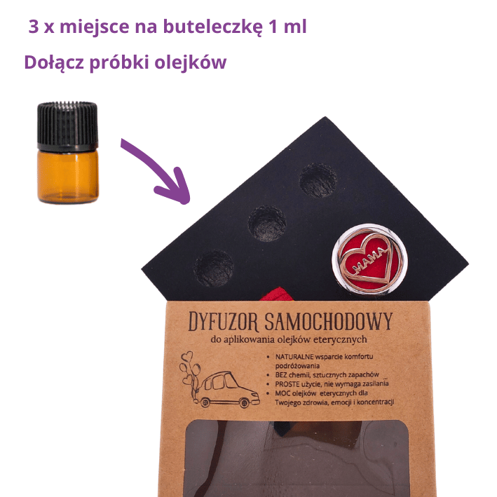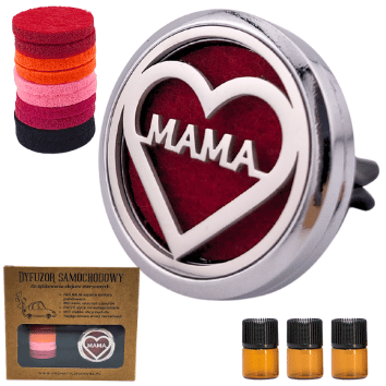 Elegancki i naturalny dyfuzor samochodowy MAMA – idealny prezent dla mamy. Działa bez prądu i kabli, uwalniając zapach z filcowego wkładu. W zestawie trzy PUSTE szklane buteleczki 1 ml, które możesz napełnić swoimi ulubionymi olejkami i stworzyć osobisty, aromatyczny upominek. Doskonały symbol ciepła, troski i relaksu w drodze.