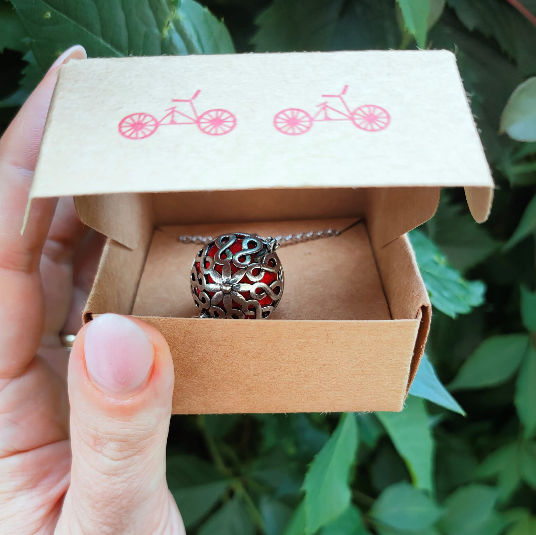 Naszyjnik zapakowany w piękne, ozdobne pudełeczko.