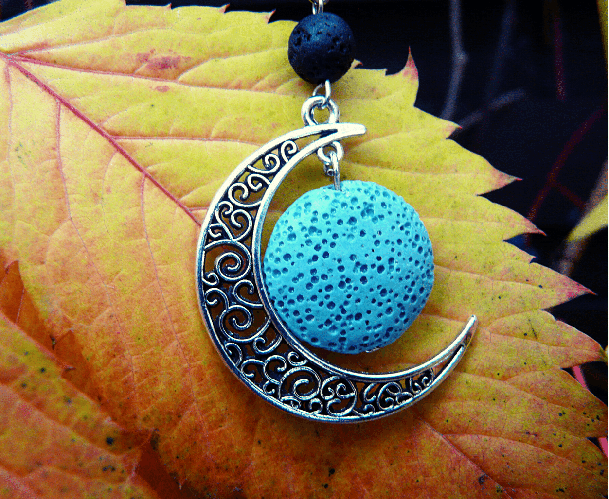 Delikatny, kobiecy naszyjnik do aromaterapii. Łańcuszek wykonany ze stali nierdzewnej, a zawieszka to duży kamień lawowy w towarzystwie księżyca. Dodatkowa czarna kulka pozwala na zastosowanie dwóch różnych olejków eterycznych i skomponowanie własnej, unikalnej kompozycji.