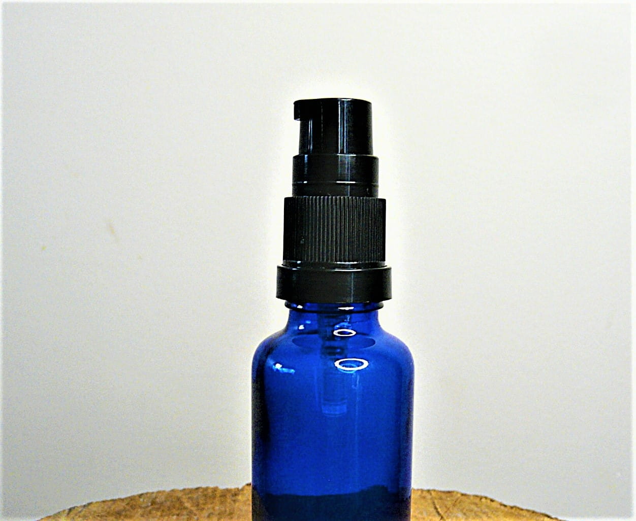 Niezwykle praktyczny zestaw składający się z butelki z grubego granatowego szkła o pojemności 30 m zakończonej końcówką z pompką do aplikacji kremu.