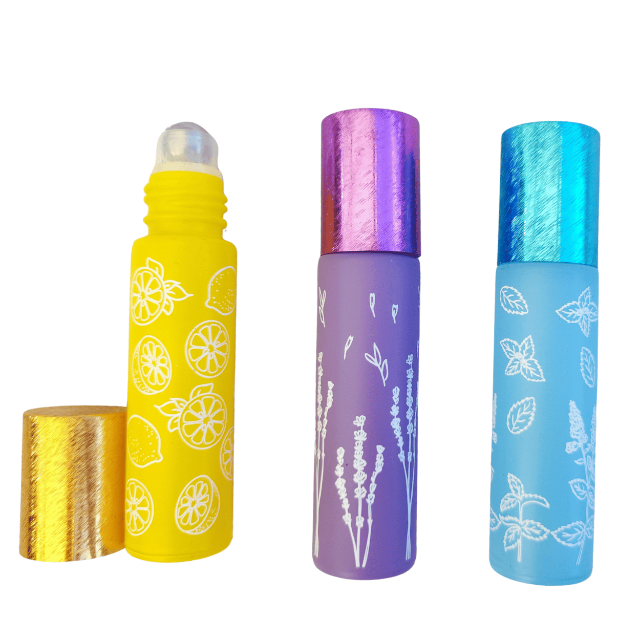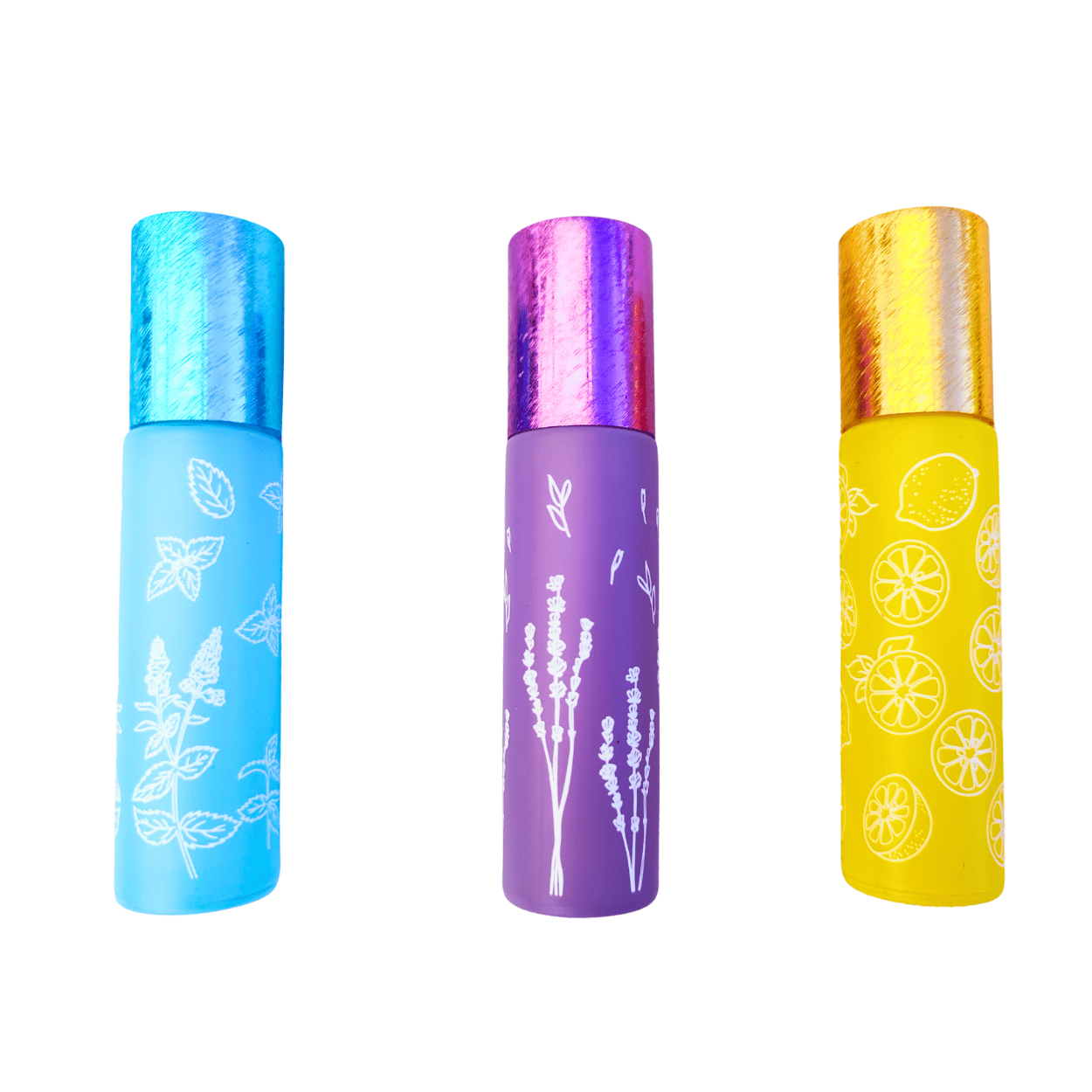 Zestaw kolorowych buteleczek roll-on ze szkła szronionego z nadrukiem roślinnym: lemon, lawenda i mięta – na mieszanki olejków eterycznych, DIY aromaterapia